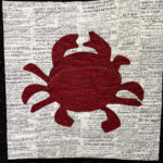 Appliqued crab on fabric with newspaper design